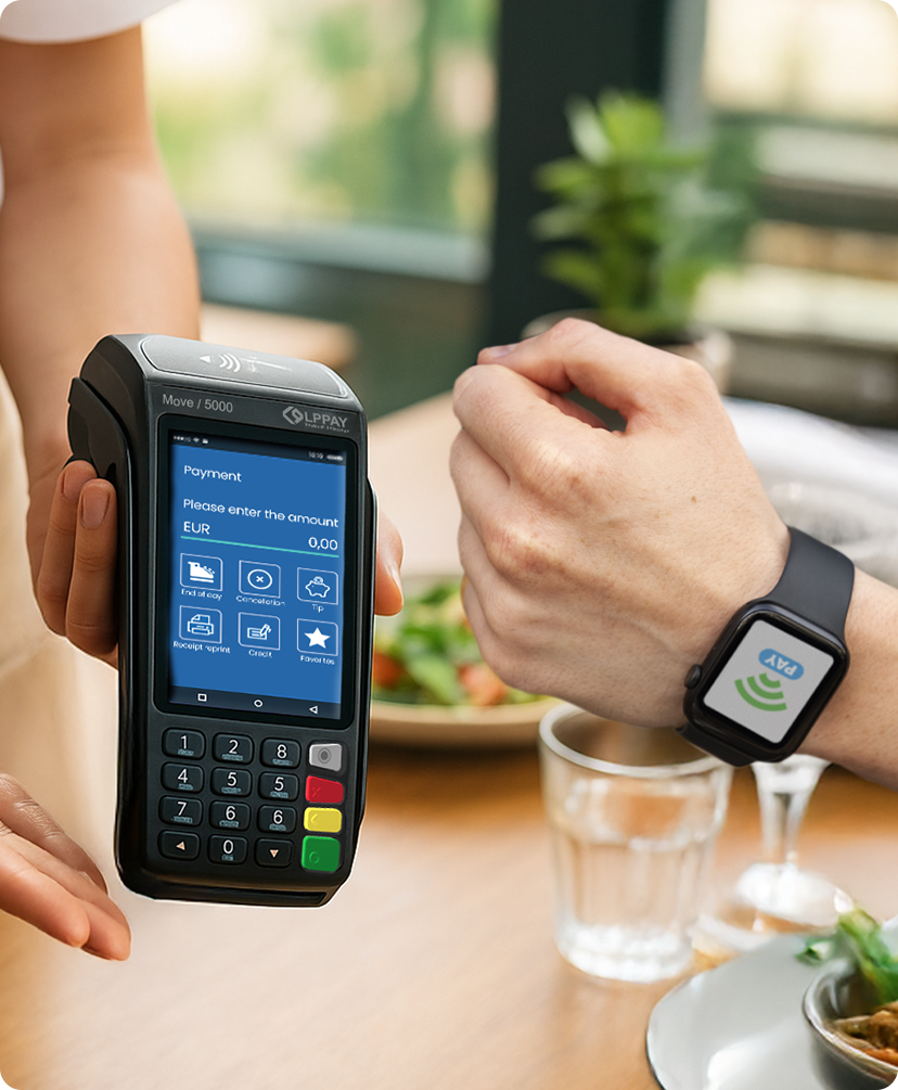Visually appealing terminal with a clear operating structure and the latest technology. Can be used flexibly through integration into your existing WLAN or use of cellular technology. Also available as a Bluetooth terminal. Switching between networks occurs automatically depending on the signal strength. Card payment transactions with future security With the high-resolution touch display and the clear operating structure, the LPPAY Move 5000 supports you in daily card payment transactions.